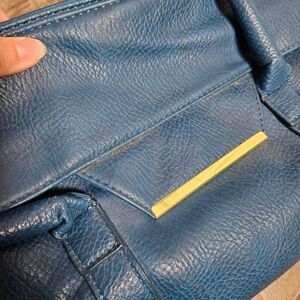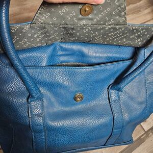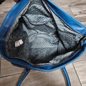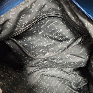 This is a blue shoulder bag by Olivia + Joy. It features a main zippered compartment with smaller pockets, as well as a magnet closure pocket on the front and a zippered pocket on the back. Note some light wear on this bag as shown in the photos. The inside of the bag is grey and features the brand name.