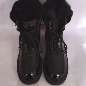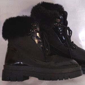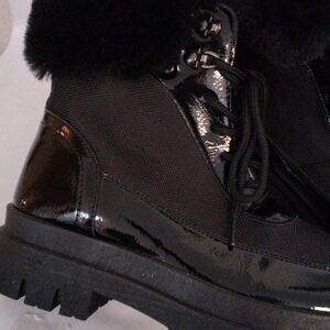 NEW. Great boots for cooler weather. Faux fur lined, folds over at tops. Lace up front. Patent above lug sole. Fabric uppers. Size 6.5 measures 9.5 long, 4 wide, 6 inch high to top. Cozy and comfortable.