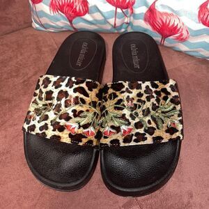 Olivia Miller animal print slides with some flowers stitched on top. Minimal wear.
