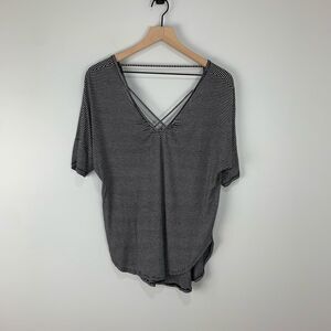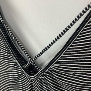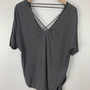 Pre-owned, good condition. V-Neck front and back with strap detailing. Tapered hemline. Pit to pit= 23”, shoulder to hem= 27” front 30” back