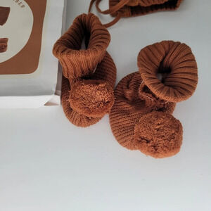 Olli Ella dinkum Doll clothing brown hat with pom pom booties knit set Umber