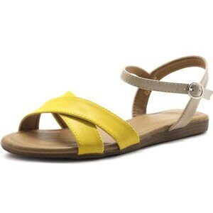 Women's Two-Tone Cross Straps Ankle Buckled Flat Sandal from Ollio in Yellow.