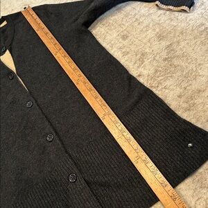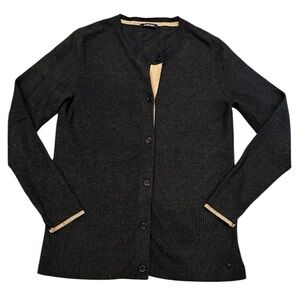 Chic black cardigan with cream accents. Classic button-up design. Perfect for layering.
