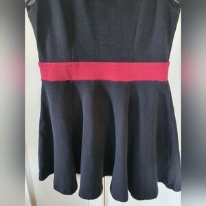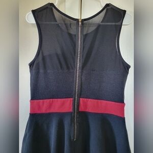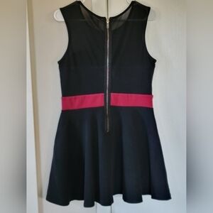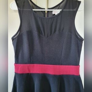 Black fit and flare skater dress with a bold red band to define your waist. Added appeal with a mesh top that leads into a sweetheart like neckline. Zipper closure.