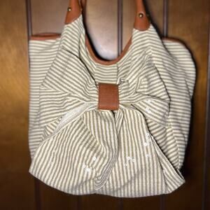 Striped with sequin detail Olsenboye tote bag. In good used condition. Interior has some marks. Some small loose threads on straps.