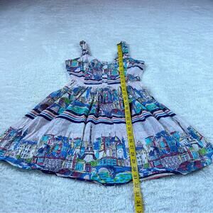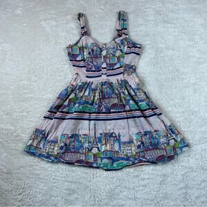 Graphic Paris design, with button up front and sweetheart neckline. Zips up the side, and not much for stretch.