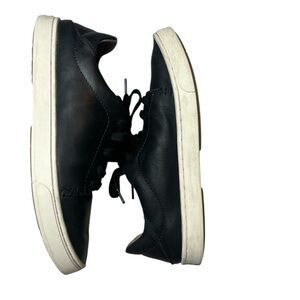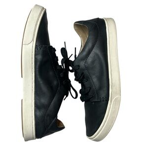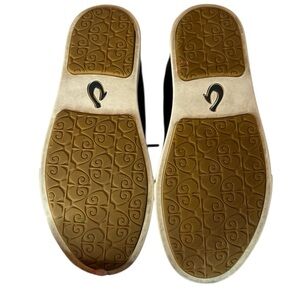 Step into style with OluKai's black and white sneakers, featuring a sleek black leather upper and a contrasting white rubber sole. These low-top sneakers offer a minimalist design perfect for everyday wear. Their versatile look makes them an ideal choice for any casual outfit.