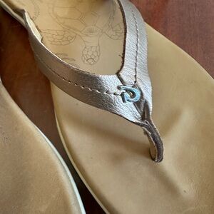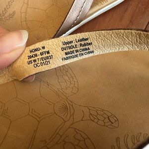 These are OluKai women’s flip flop Honu sandals in Size 7. They are in excellent condition and only worn once or twice (no dirty foot marks in the sandal at all) Thong strap is leather and a metallic copper/brown color.