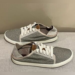 Tan/sandy grey women's OluKai sneakers with flip-down heel for slip-on option. Size 9 good condition. Lightweight with good support