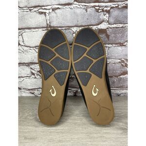 The OluKai Kiele Black Leather Loafer Convertible Slip On Flats Shoes for women in size 9M US/39 feature a round toe, flat heel, and slip-on closure for easy wear. Made with leather and a foam insole, these shoes offer cushioned comfort and arch support, making them ideal for all-day wear. The black color and solid pattern make them versatile for various occasions such as travel, activewear, and casual outings. The rubber outsole provides durability and traction, while the logo accents add a touch of style. Perfect for spring, summer, and fall seasons, these OluKai loafers are a fashionable and functional addition to any wardrobe.