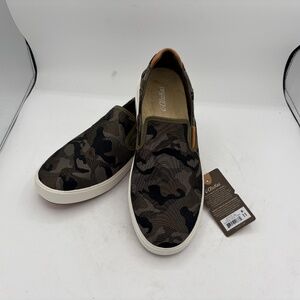 New with tags. The OluKai Lae'ahi Pa'i Slip On Shoes in size 11 feature a stylish and comfortable design perfect for casual or travel occasions. The shoes showcase a unique Ke Au Camo artwork pattern in green color, with a durable jacquard-woven upper and a cushioned insole for added comfort. With a round toe shape and slip-on closure, these shoes are lightweight and easy to wear, making them a versatile choice for the nature-themed outdoorsman. The shoes also feature a patented drop-in heel design and oil-embossed logos on the heel and quarter accents for added style and functionality.