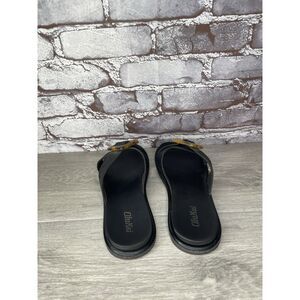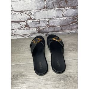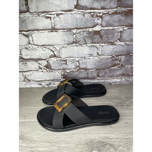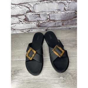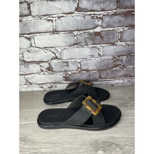 OluKai La'i Slide Black Leather Leopard Beach Sandals Women Sz 8M US/38EU