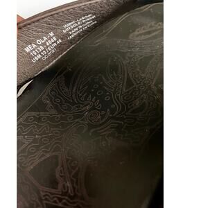 OluKai Mea Ola men’s leather sandals in size US 13 / EU 46. Brown leather upper with signature stitching and engraved footbed design. Rubber outsole with classic OluKai logo traction pattern. Pre-owned with mild wear on the footbeds and soles, but lots of life left.