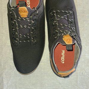 Brand new, never worn. Black canvas trimmed in brown leather.