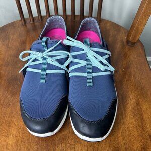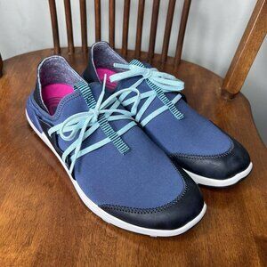 Olukai Miki Li women’s size 9 athletic slip on and lace up sneakers. In excellent preowned condition with minimal signs of wear. Comfy. Breathable. Perfect for everyday use or travel! The shades are navy blue, black white and light blue. Hot pink insoles. Contour footbed with arch support.