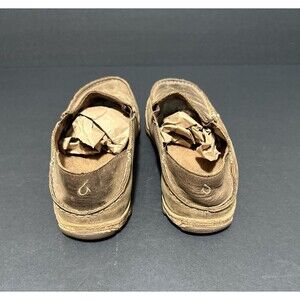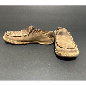 The Olukai Moloa shoe is a comfortable and stylish slipper convertible. The shoe has a slip-on closure, solid pattern, and a brown color. It is made of leather and has a rubber outsole material. It comes in a US size of 8 and an EU size of 41. The shoe has a leather lining and insole material.