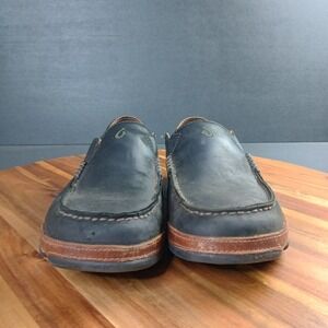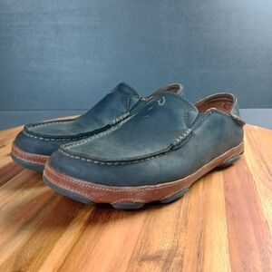 OluKai Moloa Shoes Mens Size 8.5 Black Brown Slip On Loafers Leather Slippers