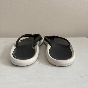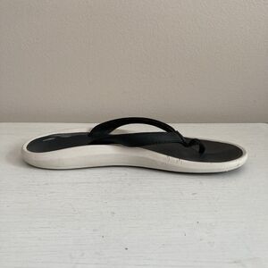 OluKai Sandals Womens Size 7 Pi'oe Casual Slip On Beach Flip Flops Black. Olukai women's Pi'oe flip flop sandals. Thong style. Slip on. Arch support. Black with white trim. No size tag but fits like a size 7. *** White paint along edges of footbed on both shoes.