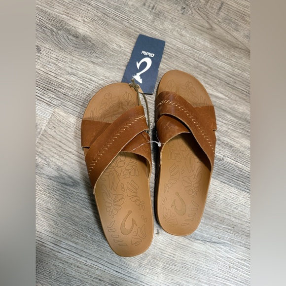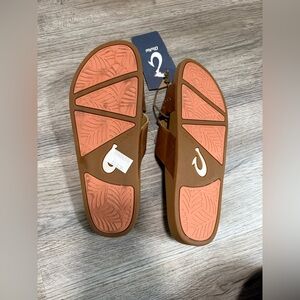 Brand new Olukai sandals, a little discolored on the bottom of one shoes from trying on, retail $100. SO comfortable!! Smoke free home!