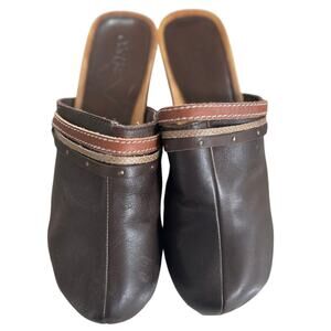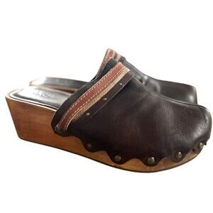 Very good pre-owned condition, small scuffs to leather. Dark brown leather, with decorative leather straps. Slip on. Wood sole. Scallop design with brass rivets.