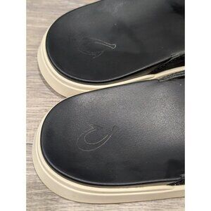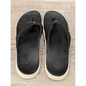 Olukai Nu'a Pi'o Sandals Womens Sz 10 Black Grip Rubber Flip Flops 20445 Summer. Please note general wear from its pre-owned condition. The shoes are black and creamish white. I believe the white area has turned creamish from use. Please let me know if you have any questions. Thanks for looking!