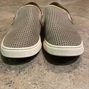 Pehuea, Clay, neutral colorway, mesh vamp, slip-on, loafer, sneaker shoes by Olukai in a women's size 7.5. Lightweight, casual, shoes. Drop in heel design that allows the heel to be folded down for slip-on convenience. The shoe also has a synthetic PU collar and heel, embossed logos. The uppers and insoles are very clean. There is one tiny dot on the side of one shoe. Not noticeable at all. See photo. The soles show use. No box included. Overall, in great pre-owned condition with some signs of wear from normal use.