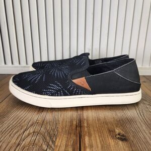 Olukai Pehuea Loafer Womens Sz 7.5 Black Palm Slip On Hawaiian Aloha Beach Shoes