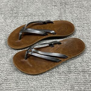 Olukai UI Flip Flop Sandals Womens Size 7 Brown Leather Silver Double Straps