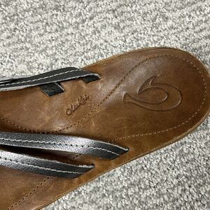 Olukai U’I Flip Flop Sandals Womens Size 7 Brown Leather Silver Double Straps