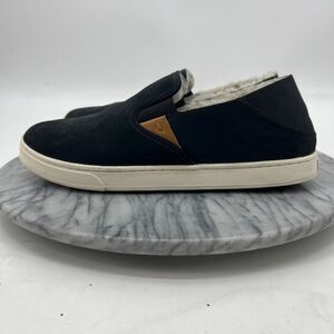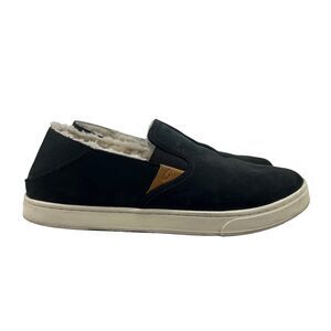 OLUKAI WOMENS 8 LOAFER BLACK SUEDE PEHUEA HEU SHEEP FUR LINED SLIP ON SHOE