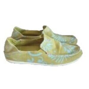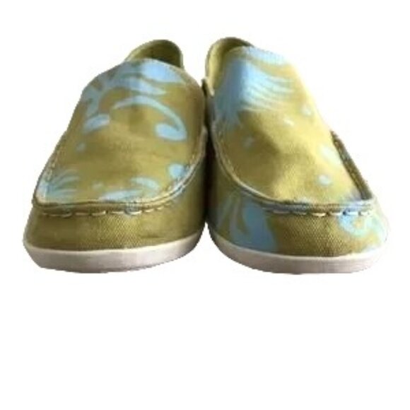 Olukai Women's Size 6 Nohea Canvas Print Slip On Green Blue Palm Design