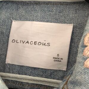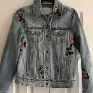 Olviaceous Floral Embroidered faded Light Denim Jacket with a few rips. Embroidery on front and back of jacket. Light denim wash. Snap closure. Gently worn. Rw.