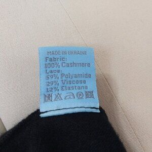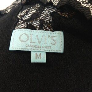 Olvis Cashmere & Lace black skirt and sweater set, size medium. Gorgeous thin knit super soft 100% cashmere with stretch lace details. In gently preowned condition, no flaws noted. No pilling, fading, holes, or wash wear noted. Measurements are approximate, lying flat.
