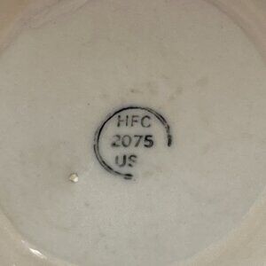 This ceramic mug is cream with metallic gold trim and a multicolor illustration. The stein measures about 4 3/4" tall and 3" diameter at the bottom. The underside is marked "HFC 2075 USA."