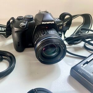 Olympus EVOLT E-520 digital SLR camera 10.0 MP maximum resolution and a 14-42mm lens, Includes: 14-42 lens, lens hood, battery charger, USB connector. Does not include storage device or camera bag. Works great, no issues.