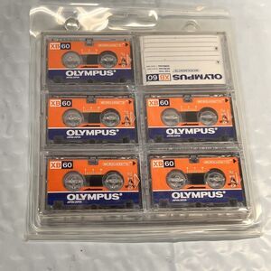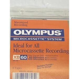 This listing is for a pack of six Olympus Microcassette Tapes, model XB60, with a reusable package. One of the tapes is missing from the package. The tapes are compatible with Microcassette recorders and can be used for dictation and voice recording. The brand is Olympus, a well-known manufacturer of high-quality audio equipment based in Japan.