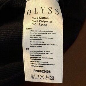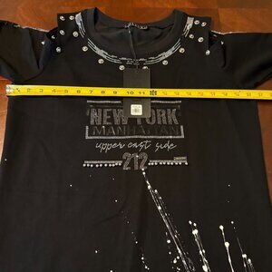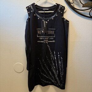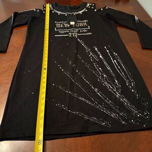 keywords: Olyss dress, New York print, black dress, long sleeve, studded dress, medium size, professional wear, cotton blend, polyester dress, urban style, machine washable, Turkey made, graphic dress