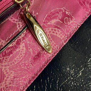 This striking tote bag by Sharif features a vibrant tie-dye design complemented by blue accents. Crafted from patent leather, the bag offers ample storage with its front and side zip pockets. The tote's dual handles ensure comfortable carrying, making it a practical accessory for daily use.