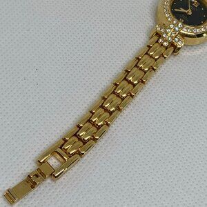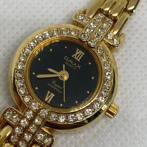 Omax gold tone women watch 22mm round case rhinestones quartz analog links bracelet size 7”, mint condition battery installed