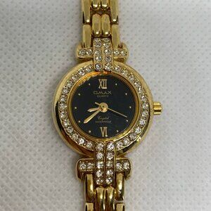 Omax gold tone women watch 22mm round rhinestones quartz analog 7” running