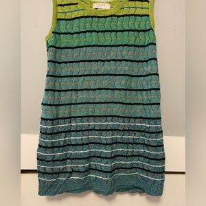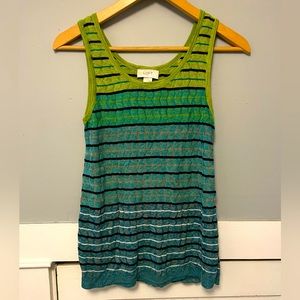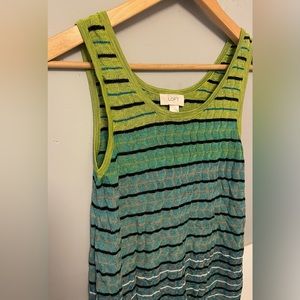 LOFT clothing brand. Subtle Ribbed Sweater Tank Top. Pullover. Round scoop neck and back. Sleeveless. Ribbed neck and hem. Classic fit; follows your contours with a little room. Longer length; hits below natural waist - 24.5” long. Sweater weight: lightweight. Very soft knit. 100% rayon. Color: textural ombré, teal blues & pear green. Women’s size Small. MSRP $34.99.