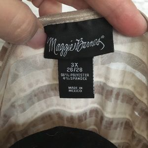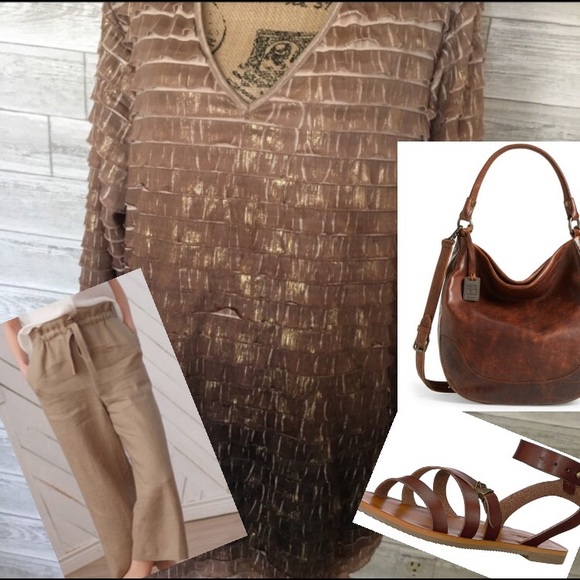 Brown tones graduating up to tan with ruffle over ruffle and a hint of metallic shimmer. Stretchy comfort and classic fun over a skirt, slacks or jeans. In excellent, pre-worn condition. No rips or tears. Smoke-free home.