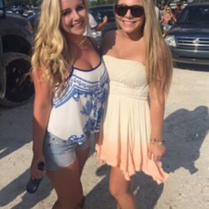 strapless, has sticky wire so won't fall, very comfortable, worn once (see picture), ombré fade from white/cream to pink, frayed bottom