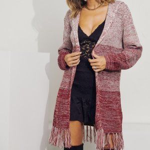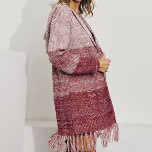 The Barbara Fringe Sweater features a longline silhouette, fringe hem, hooded sweater and Wine & ivory ombré colorblock.