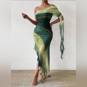 Ombre Print One Shoulder Ruched Ruffle Trim Dress Maxi Women Outfit