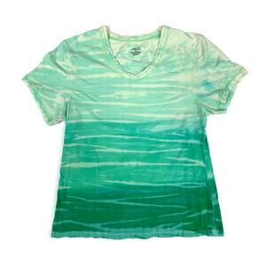 BCG green abstract stripes tee shirt, v neck, has stretch, relaxed fit, has a few small pin spots on the back that are hardly noticeable, otherwise gently used overall good condition