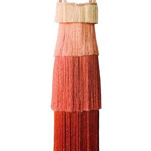 They call it a cascading layered fringe-maxi dress with boat neck detail. Lined with a bodycon mini dress made of stretch Ponte. Light to dark (ombré effect) and Long to short. Zip in the back.