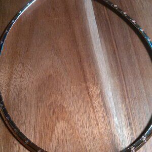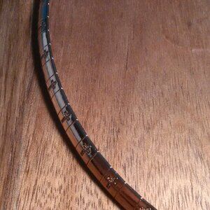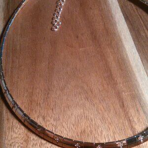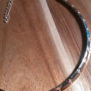 This stainless steel piece features real rose gold ion plating for a durable, old-fashioned look. It has a collar design with a pattern of tiny crosses stamped about the necklace. It is approximately 18 inches in length and is in brand new condition.