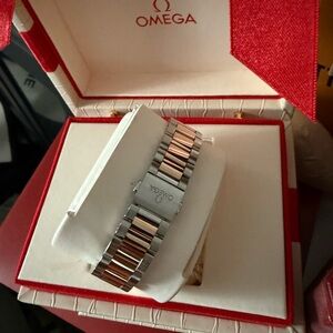 Stylish Omega watch featuring a blue dial. Rose gold and stainless steel bracelet. Perfect for any occasion.