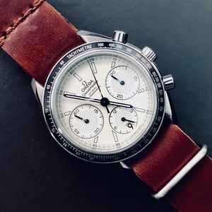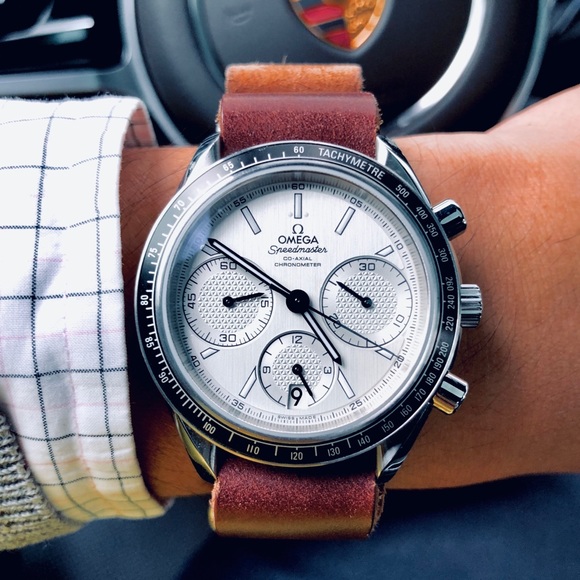 The distinguished Omega Speedmaster Racing comes with the bulletproof automatic Calibre 3300 movement with black aluminum bezel tachymetre. Luminescent hands and markers. Date display at the 6 o'clock position. Chronograph - three sub-dials displaying: 60 second, 30 minute and 12 hour. Movement has a 52-hour power reserve, watertight 330ft. Includes original oak box with authenticity paperwork, original black Omega deployment strap, and custom Tanner Goods leather calfskin nato strap as shown.